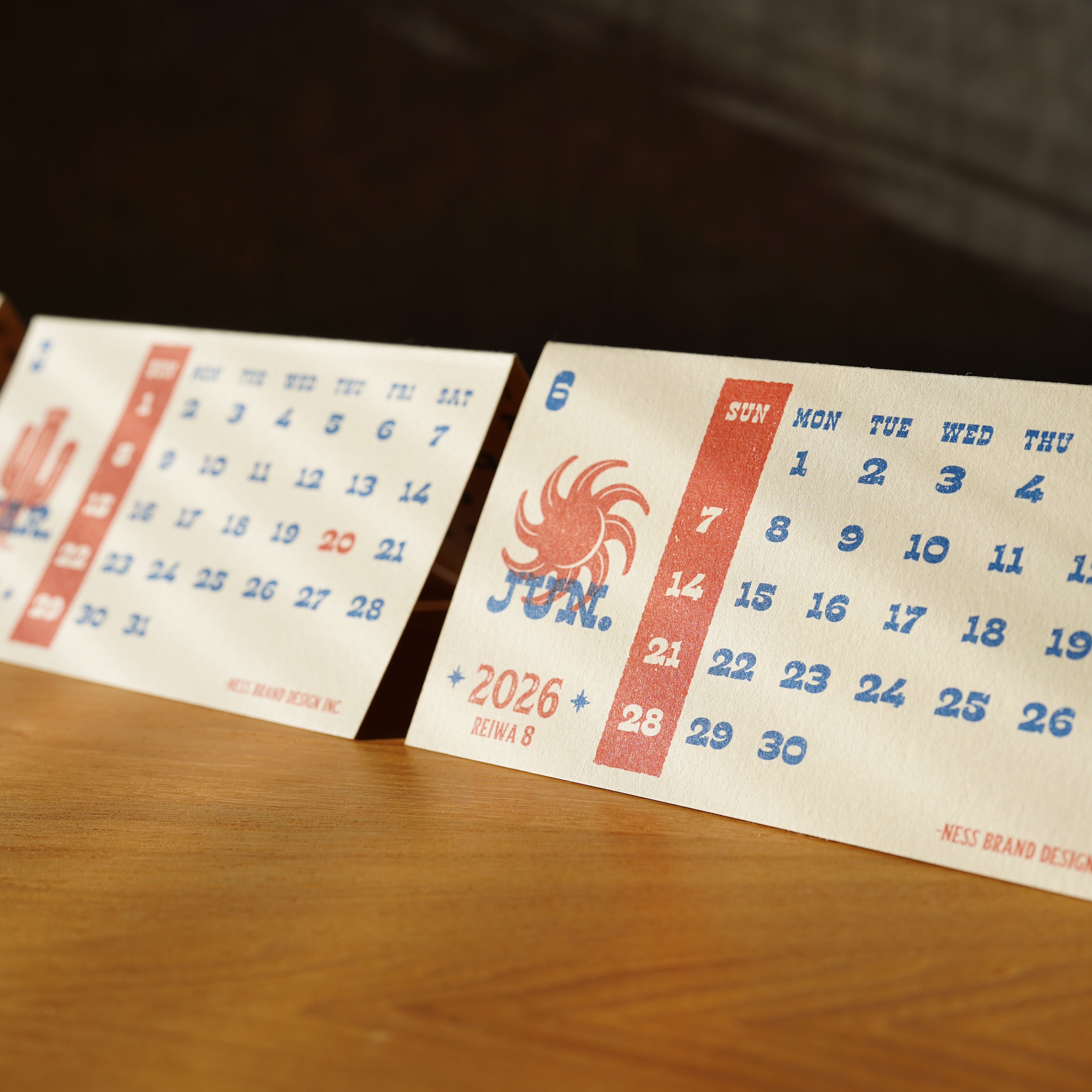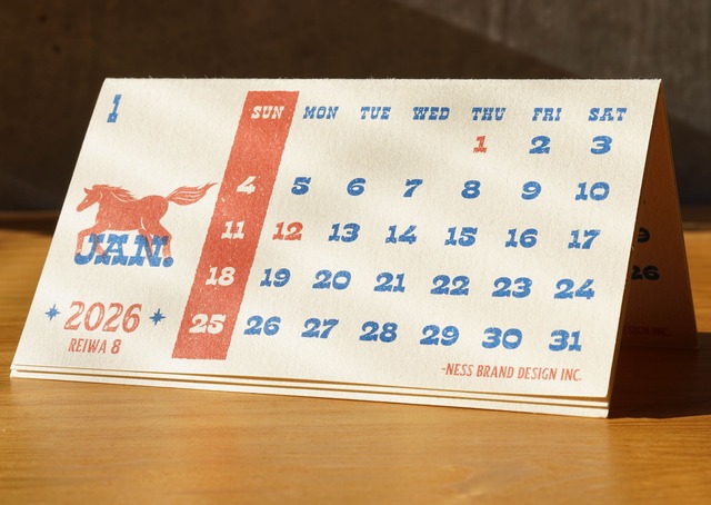 西部開拓時代のレトロな印刷物やサインペインティングを思わせる、ウェスタンレトロなタイポグラフィーを主役にした卓上カレンダーです。 一枚の厚紙を折るだけで自立する、リングレス構造。 金具を使わず、紙そのものの質感と構造で成り立っています。 新品なのに、最初から使い慣れた感じで、無骨で道具のような佇まいに仕上げました。 [ 特徴 ] ・折るだけで自立する卓上カレンダー ・リングレスで資源を抑え、分別も簡単 ・並べる/重ねる/かぶせる/切ってカードにするなど使い方は自由 ・両面印刷(裏返して折り直すことで表情が変わります) [ 紙と印刷について ] ・用紙には、コースター用途にも使われる富士共和製紙 FKコースターG(0.5mm厚)を採用。ザラついた繊維感とインクをしっかり受け止める紙質に、オフセット印刷・特色2色で刷ることで、ヴィンテージポスターのようなムラや奥行きのある表情が生まれています。 新品でありながら、最初からどこか“使い慣れた道具”のような雰囲気があるのも、この紙と印刷ならではです。 [ 使い方について ] デスクにきちんと並べるのも、棚に無造作に置くのも自由。 切り分けてカードのように使ったり、重ねたり、かぶせたり─使い方を決めない余白を残したカレンダーです。 [ サイズ・仕様 ] 仕上がりサイズ:W 152mm × H 83.5mm 使用用紙:富士共和製紙 FK コースターG(0.5mm厚) 印刷:オフセット印刷/特色2色 ※紙の特性上、使用に伴い折りが緩む場合があります。 その際は再度折り直してお使いください。 紙のクセや経年変化も、このカレンダーの表情のひとつとしてお楽しみください。